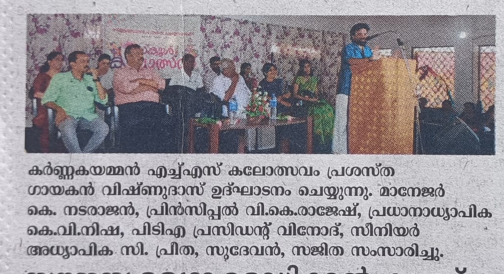 കർണ്ണകയമ്മൻ ഹയർ സെക്കന്ററിസ്കൂൾ കാലോത്സവം റിഥ02025 പ്രശസ്ത ഗായകനും ഐഡിയ സ്റ്റാർസിംഗർ ഫെയിം വിഷ്ണുദാസ് നിർവ്വഹിച്ചു.മാനേജർ നടരാജൻ മാസ്റ്റർ,പ്രിൻസിപ്പാൾ വി കെ രാജേഷ്,പ്രധാനഅധ്യാപിക കെ വി നിഷ,,പി ടി എ പ്രസിഡന്റ് വിനോദ്, ,സീനിയർ അധ്യാപിക പ്രീത സി,കാലോത്സവ കൺവീനർ മാരായ സുദേവൻ,സജിത എന്നിവർ ആശംസകളും നൽകി